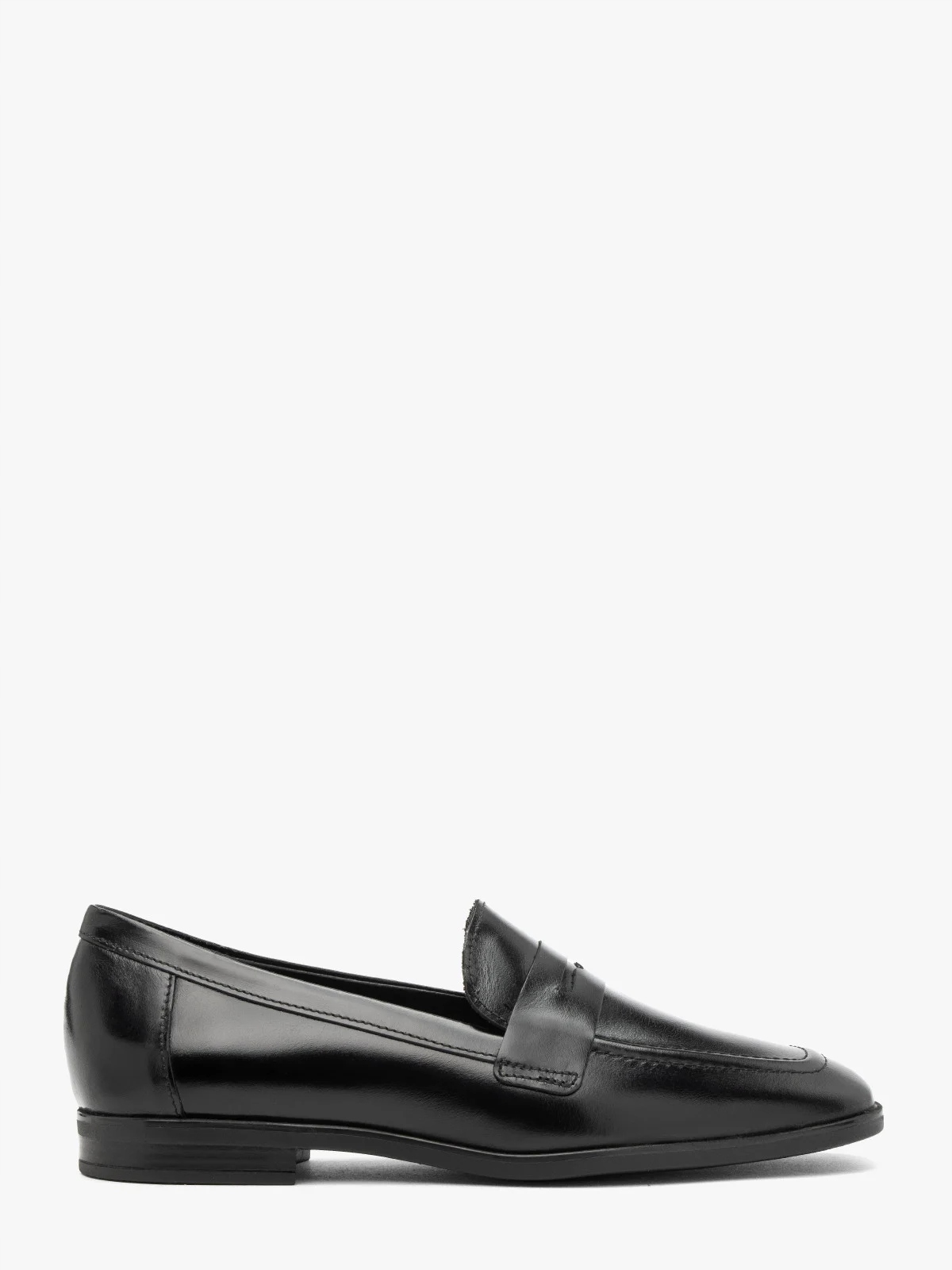 Proste, minimalistyczne mokasyny w ponadczasowej czerni to must-have w każdej szafie. Bez zbędnych zdobień, te mokasyny wykonane są z wysokiej jakości skóry licowej, co zapewnia im elegancję i wygodę. Niewielki obcas (2 cm) i kwadratowy nosek, który jest mocno w trendach, nadają im współczesny charakter. Skórzana wyściółka i podszewka dbają o komfort przez cały dzień. Wsuwane zapięcie i brak zamka sprawiają, że są to buty łatwe do założenia i doskonałe do codziennych stylizacji.