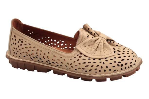 Damskie mokasyny wykonane z wysokiej jakości skóry cielęcej w beżowym kolorze z subtelnym ażurowym wzorem, który dodaje im lekkości i elegancji. Model zachwyca klasycznym krojem, wzbogaconym ozdobną kokardą, nadającą butom kobiecego wdzięku. Wnętrze wykończone miękką, skórzaną wkładką gwarantuje komfort noszenia przez cały dzień.