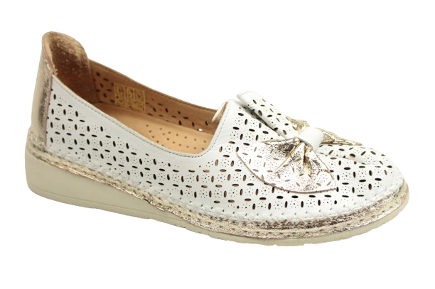 Mokasyny damskie wykonane z białej skóry cielęcej, wykończone ażurowym wzorem i złotymi detalami. Dekoracyjna kokarda w metalicznym odcieniu podkreśla przód cholewki, ozdobiony delikatnym marszczeniem. Złoty otok wokół podeszwy dodaje całości lekkości i elegancji. Model osadzony na niskim koturnie, który zapewnia komfort podczas codziennego noszenia.